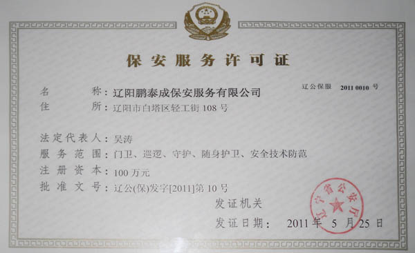 遼陽鵬泰成保安服務(wù)有限公司成立于2011年6月,是經(jīng)省公安廳及遼陽市公安局批準,市工商局審批注冊,并在遼陽市公安局指導(dǎo)下成立的正規(guī)集團公司。2015年納入公安局“天眼五護工程”試點單位。